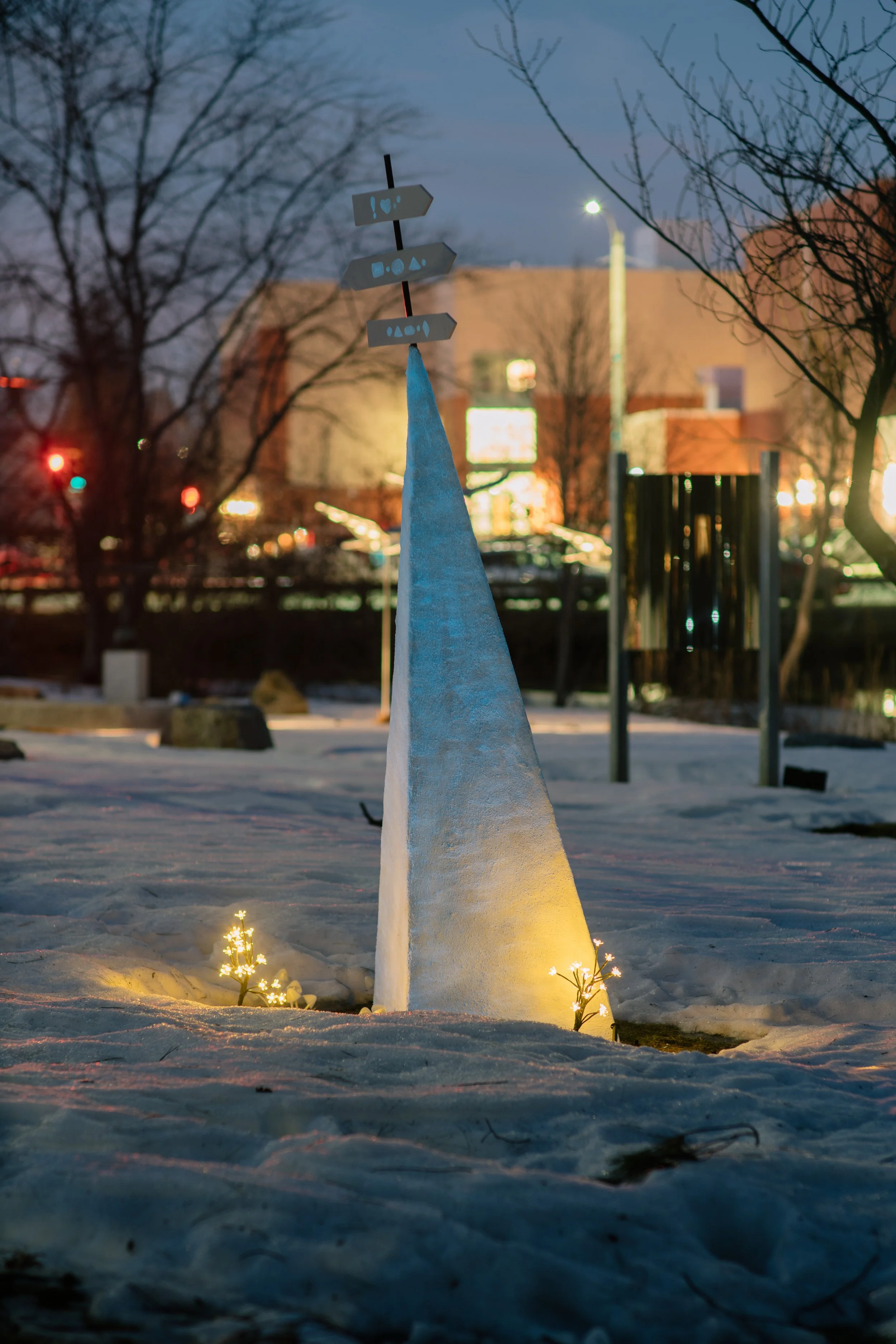 This installation is a luminous earthwork conceived as a moment of orientation within instability. Inspired by theorized nuclear waste warning monuments, fairytale landscapes, and speculative signage. Activated at night, the work becomes a glowing guide. Sometimes there is no correct direction, only the next step forward.